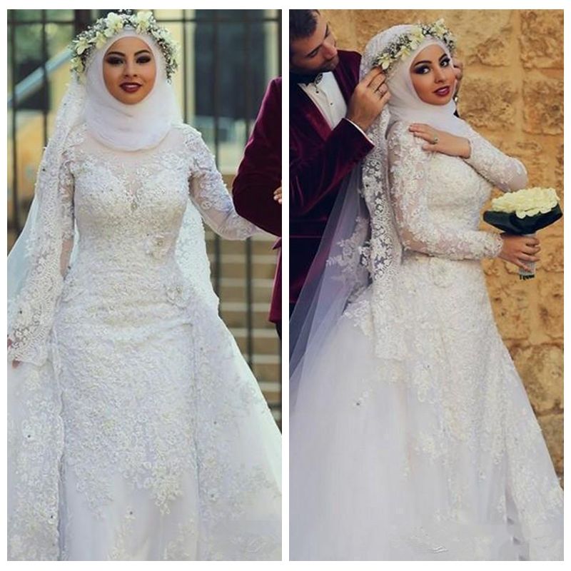 Hijab Bridal Gown Lace Appliqued Classic Beaded Sweep Train White Arab Long Sleeve Muslim Wedding Dress With Detachable Skirt Buy Muslim Hijab