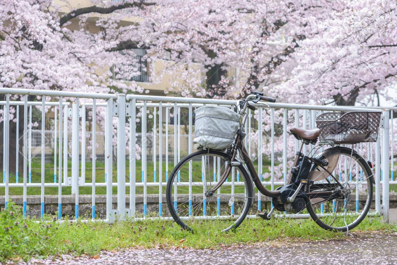 Old Bicycle Parking On Street With Cherry Blossom Flower Bike